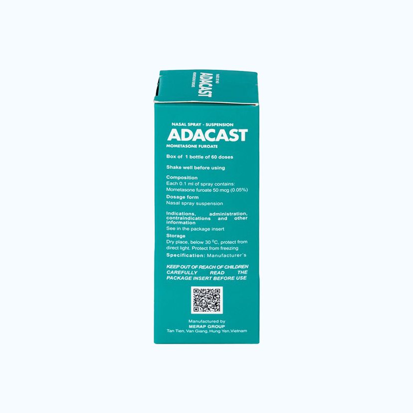 - Điều trị triệu chứng viêm mũi theo mùa hoặc quanh năm cho người lớn và trẻ em từ 2 tuổi trở lên. Ở những bệnh nhân có tiền sử viêm mũi dị ứng theo mùa với triệu chứng trung bình đến nặng, nên điều trị dự phòng với Adacast từ 2 đến 4 tuần trước khi bắt đầu mùa phấn hoa.