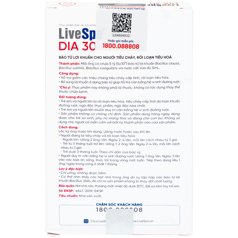 LiveSpo DIA 30 chứa 5 tỷ lợi khuẩn bào tử lợi khuẩn Bacillus Subtilis, Bacillus Clausii, Bacillus Coagulans, cùng 5ml nước cất vừa đủ, ứng dụng công nghệ tiên tiến giúp giải quyết tiêu chảy cấp, rối loạn tiêu hóa nhanh hơn hẳn so với các sản phẩm thông thường.