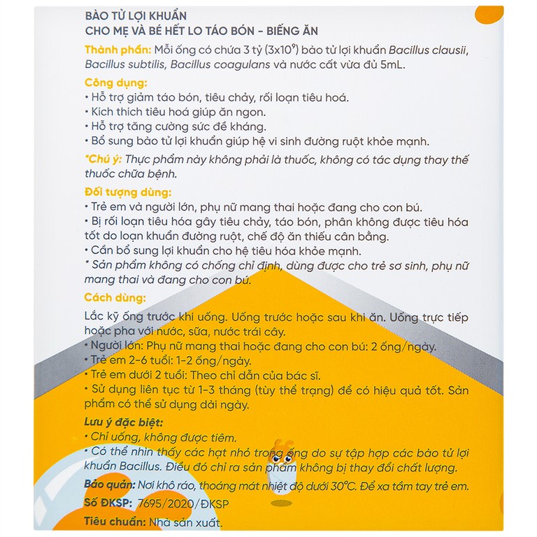 - Trên 3 tỷ (> 3 x 10⁹) bào tử lợi khuẩn B. clausii, B. subtilis và B.coagulans.