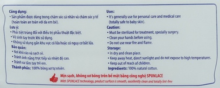 Quá trình xử lý màng bông sử dụng tia nước áp lực cao không dùng hóa chất nên hoàn toàn không gây ra kích ứng cho những vùng da non, không gây ảnh hưởng cho vết thương. Đối với trường hợp điều trị đặc biệt trong phẫu thuật và các vết thương lớn bông được tiệt trùng bằng công nghệ E.O.Gas.