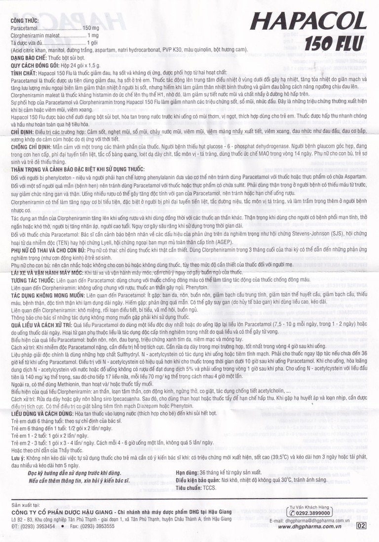 Hapacol 150 Flu được bào chế dưới dạng bột sủi bọt, hòa tan trong nước trước khi uống có mùi thơm, vị ngọt, thích hợp dùng cho trẻ em. Thuốc được hấp thu nhanh chóng và hầu như hoàn toàn qua hệ tiêu hóa.