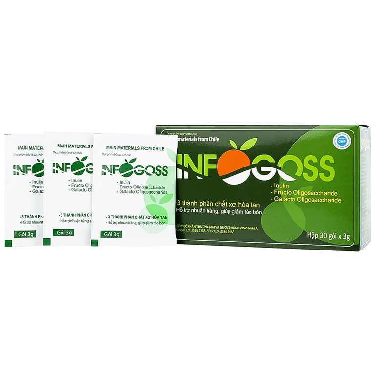Chứa 3 thành phần chất xơ hòa tan cần thiết cho cơ thể, Infogos 3g là sản phẩm thích hợp dùng cho người bị táo bón lâu ngày do chế độ ăn thiếu chất xơ, giúp hỗ trợ phòng chống táo bón và chứng rối loạn tiêu hóa.