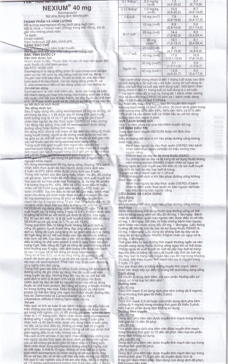 Trong một nghiên cứu lâm sàng ngẫu nhiên, mù đôi, đối chứng với giả dược, bệnh nhân đã chẩn đoán xác định xuất huyết tiêu hóa qua nội soi theo phân loại Forrest la, b, la hay Ilb (chiếm tỉ lệ tương ứng là 9%, 43%, 38% và 10%) được điều trị ngẫu nhiên với Nexium dung dịch tiêm truyền (n=375) hoặc giả dược (n=389). Sau khi điều trị nội soi để cầm máu, bệnh nhân được cho dùng giả dược hoặc được truyền tĩnh mạch liều cao 80mg esomeprazole trong 30 phút và tiếp theo truyền tĩnh mạch liên tục 8mg/giờ trong 72 giờ.