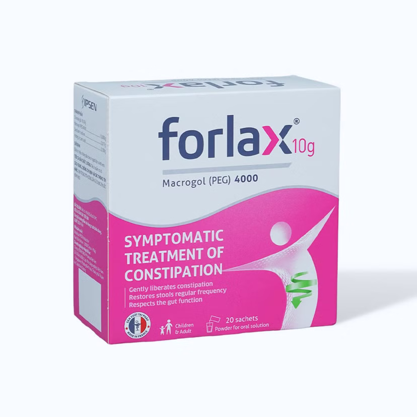 Bột pha uống Forlax là một sản phẩm thuốc dùng để điều trị táo bón. Thành phần chính của Forlax là macrogol 4000, một loại polymer có khả năng giữ nước trong ruột, giúp làm mềm phân và tăng cường nhu động ruột. Sản phẩm được pha chế dưới dạng bột hòa tan trong nước, không có màu và mùi, phù hợp cho cả người lớn và trẻ em từ 8 tuổi trở lên.
