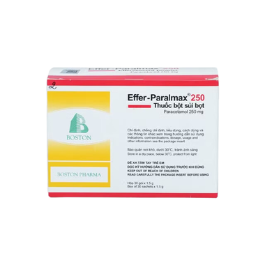 Bột sủi bọt Effer- Paralmax 250mgBột sủi bọt Effer-Paralmax 250mg điều trị các chứng đau, sốt từ nhẹ đến vừa ở trẻ em (Hộp 30 gói x 1,5g)
