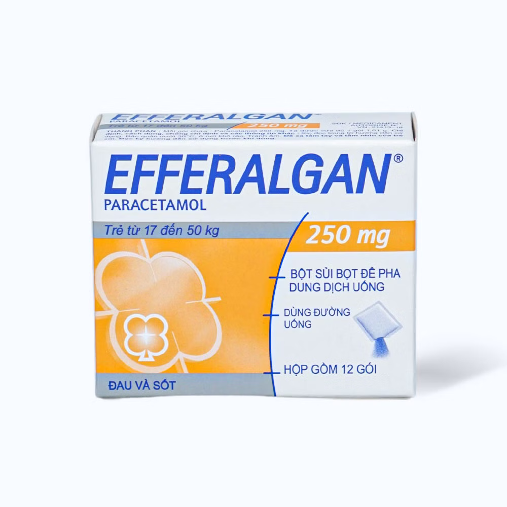 Efferalgan 250mg của Công ty Dược phẩm UPSA SAS (Pháp), thành phần chính là paracetamol. Thuốc dùng điều trị các chứng đau và/hoặc sốt như: Đau đầu, tình trạng như cúm, đau răng, nhức mỏi cơ, đau bụng kinh. Thuốc dùng cho trẻ em có cân nặng từ 17 – 50 kg.
