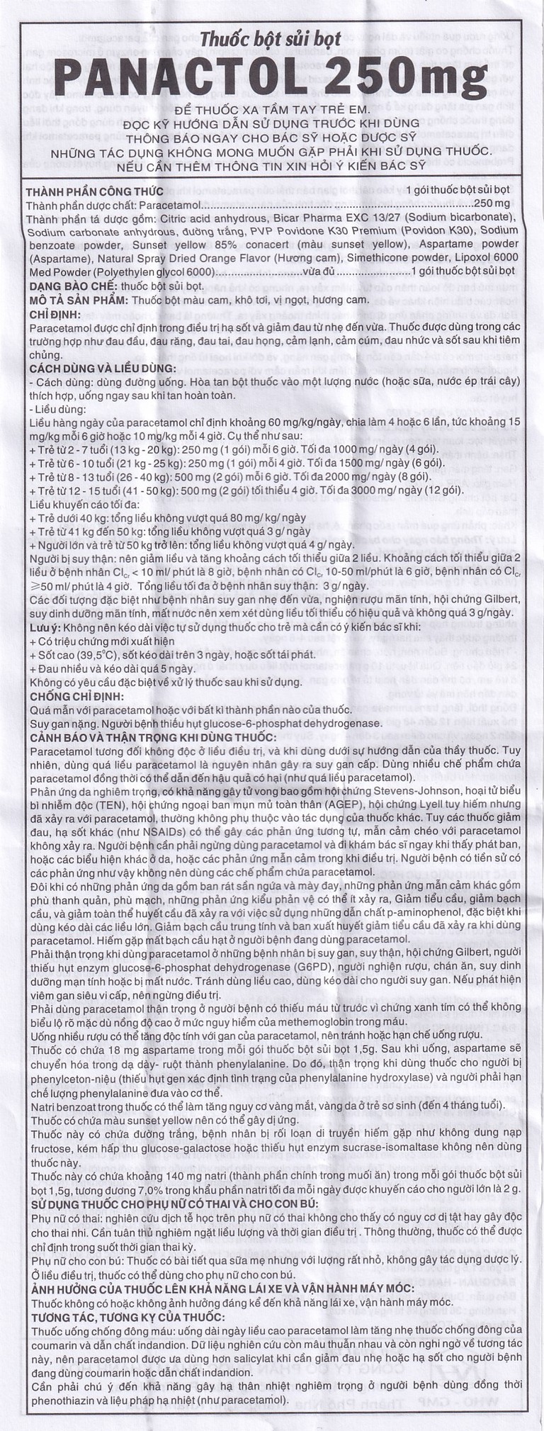 Thuốc Panactol dạng bột sủi bọt, hòa tan bột thuốc vào một lượng nước (hoặc sữa, nước ép trái cây) thích hợp, uống ngay sau khi tan hoàn toàn.
