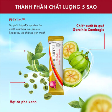 - PI2XlimTM: sự pha trộn thích hợp của chiết xuất hoa trà, chiết xuất protein khoai tây và chất xơ yến mạch giúp ngăn chặn hiệu quả sự hấp thụ chất béo và carbohydrate, giảm mỡ dưới da (mỡ bên dưới da) và mỡ nội tạng (mỡ xung quanh các cơ quan nội tạng).