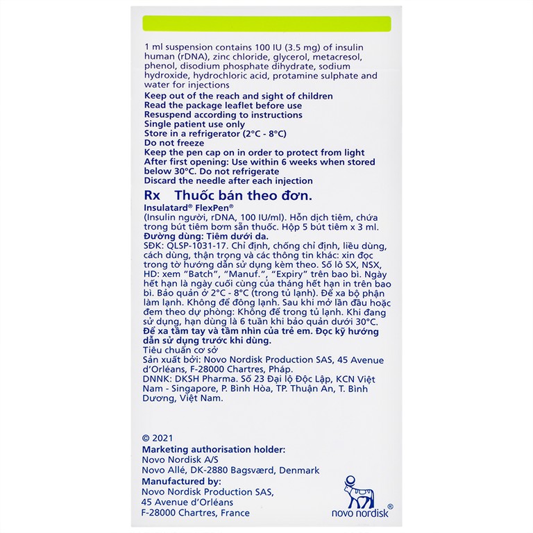 Thành phần của Bút tiêm Insulatard FlexPen 100IU/ml