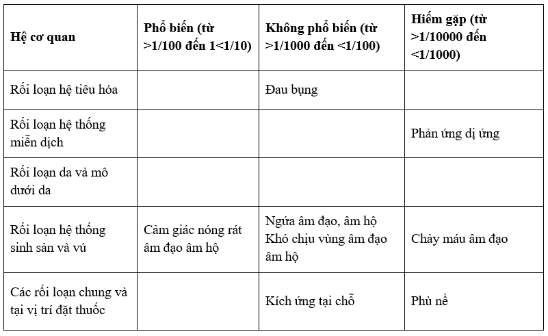 - Rối loạn hệ thống sinh sản và vú: Bong da âm đạo, khí hư âm đạo, xuất huyết âm đạo, ban đỏ âm đạo âm hộ, khó chịu vùng âm đạo âm hộ, cảm giác nóng rát âm đạo âm hộ, ngứa âm đạo âm hộ, đau âm hộ âm đạo.