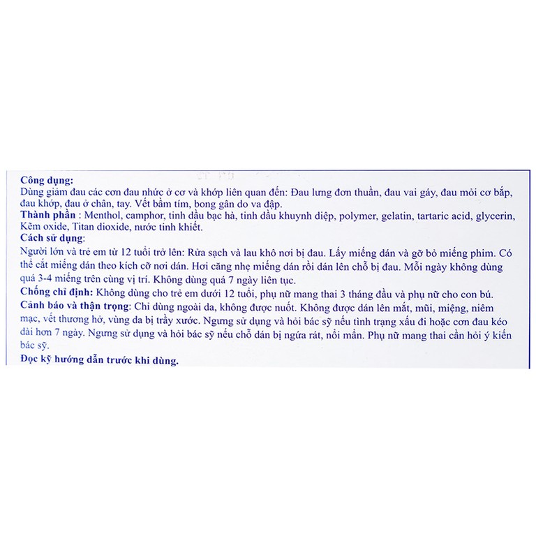 Chỉ dùng ngoài da, không được nuốt. Không được dán lên mắt, mũi, miệng, niêm mạc, vết thương hở, vùng da bị trầy xước.