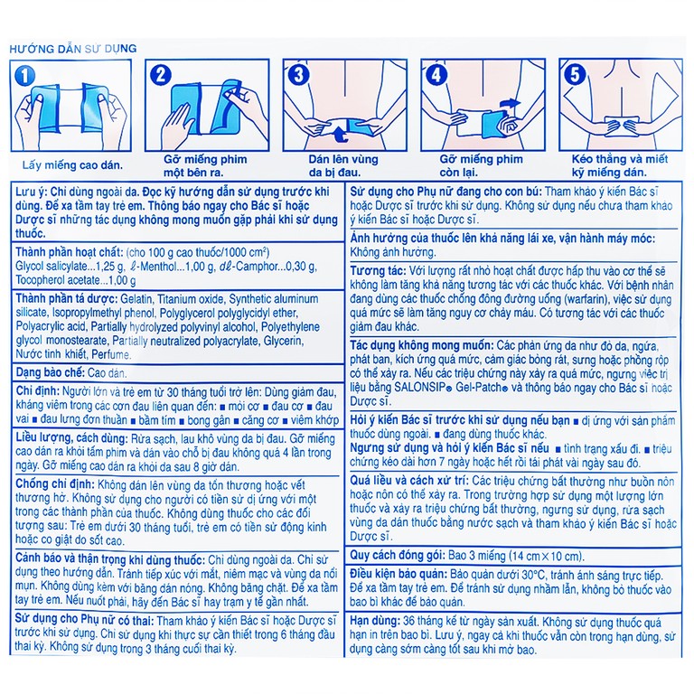 Cao dán Salonsip Gel – Patch chỉ định dùng cho người lớn và trẻ em từ 30 tháng tuổi trở lên dùng giảm đau, kháng viêm trong các cơn đau liên quan đến: Mỏi cơ, đau cơ, đau vai, đau lưng đơn thuần, bầm tím, bong gân, căng cơ, viêm khớp.