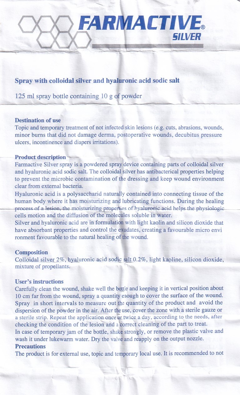 Chai xịt bạc Farmactive Silver Spray dùng trong điều trị các tổn thương da không bị nhiễm trùng, bao gồm: Những vết cắt, trầy xước, vết thương hở, bỏng cục bộ, vết thương sau phẫu thuật, vết loét điểm tỳ, vết thương hoại tử do tắc tĩnh mạch, kích ứng da do tiểu tiện hoặc tã lót.