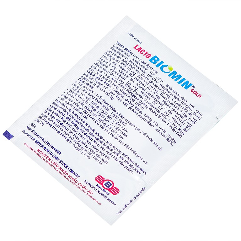 Cốm vi sinh Lacto Biomin Gold giúp bổ sung vi khuẩn có ích, vitamin và lysin cho cơ thể, hỗ trợ tăng cường tiêu hóa.