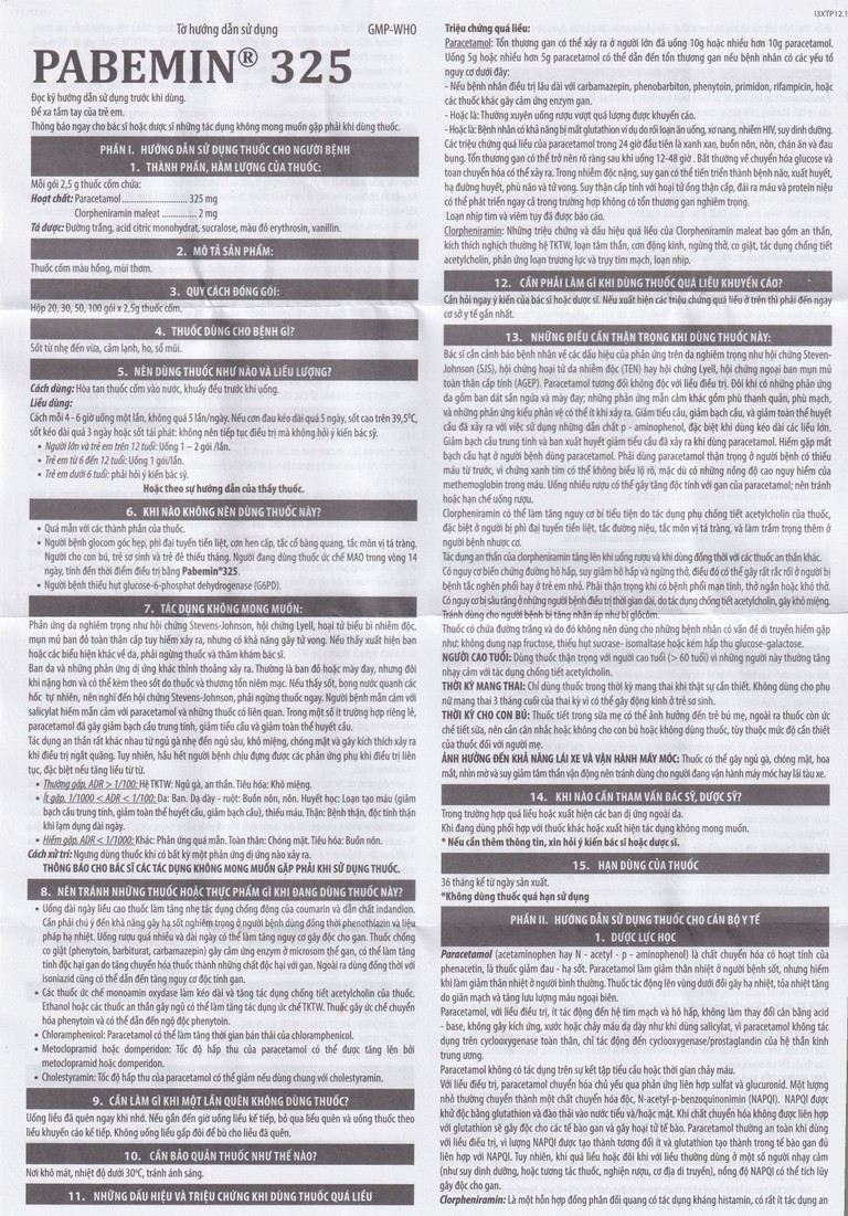 Cốm Pabemin 325 Pharimexco điều trị sốt từ nhẹ đến vừa, cảm lạnh, ho, sổ mũi (30 gói)Cốm Pabemin 325 Pharimexco điều trị sốt từ nhẹ đến vừa, cảm lạnh, ho, sổ mũi (30 gói)
