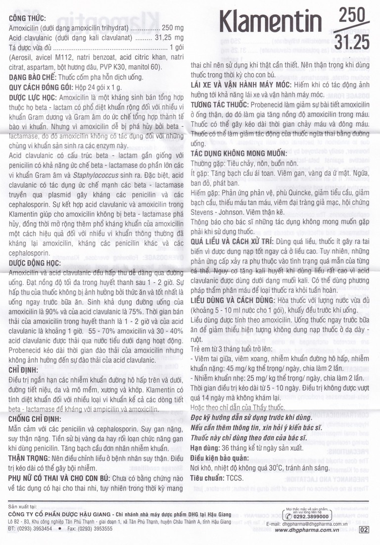 - Dạng thuốc, hàm lượng: Thuốc cốm pha hỗn dịch uống, 250/31,25 mg