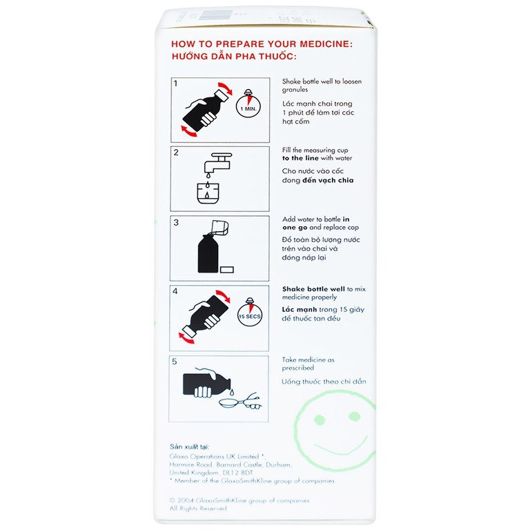 Để nâng cao tính tuân thủ và cải thiện tính chính xác của liều dùng cho trẻ rất nhỏ, mỗi chai đa liều chứa 50ml hỗn dịch có thể kèm thêm một bơm chia liều. Tuy nhiên, việc chia liều bằng thìa nên được xem là một lựa chọn thích hợp hơn nếu trẻ có thể uống thuốc từ thìa.