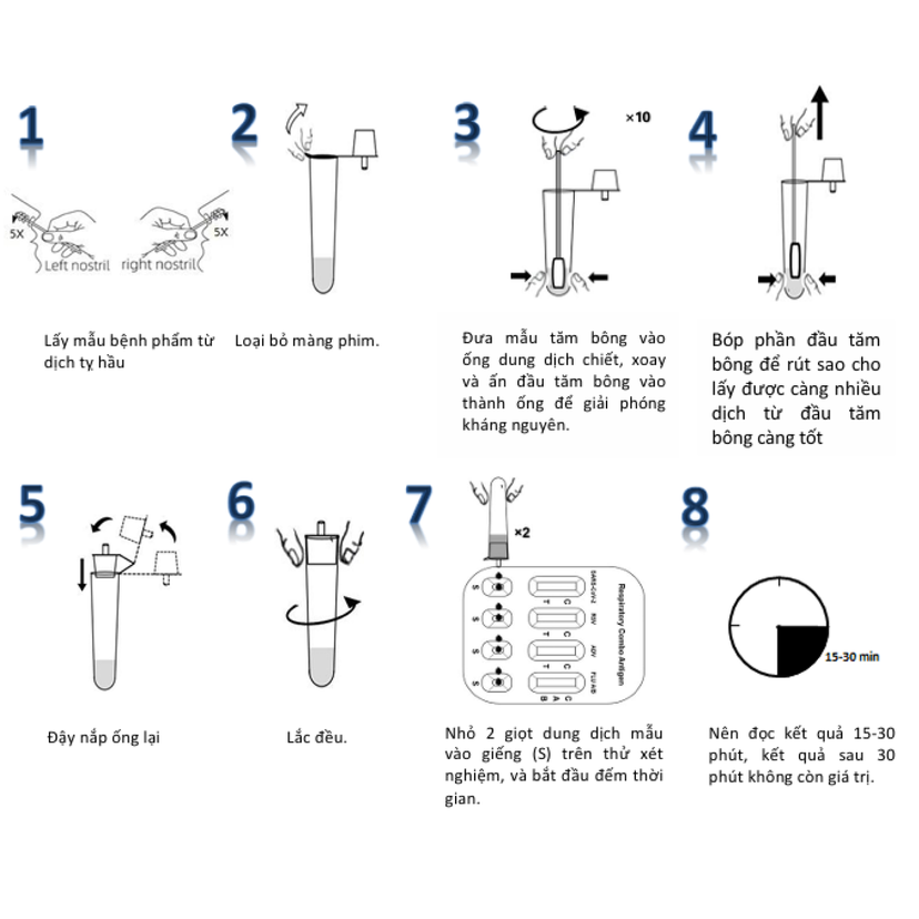 - Chỉ sử dụng tăm bông vô trùng được cung cấp trong Bộ Respiratory Combo Antigen Rapid Test.