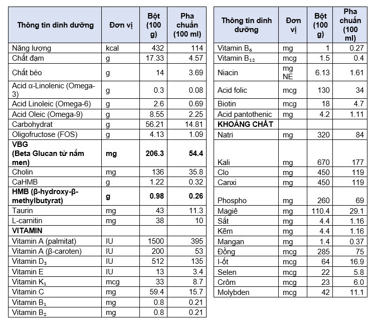 Tinh bột bắp thủy phân, DẦU THỰC VẬT (dầu hướng dương giàu oleic, dầu đậu nành, dầu hạt cải), sucrose, natri caseinat, đạm đậu nành tinh chế, oligofructose, đạm whey cô đặc, KHOÁNG CHẤT (kali citrat, tricanxi phosphat, magiê sulfat, magiê clorid, kali clorid, natri citrat, dikali phosphat, natri clorid, canxi carbonat, dimagie phosphat, kali hydroxid, sắt sulfat, kẽm sulfat, mangan sulfat, đồng sulfat, crôm clorid, kali iodid, natri molybdat, natri selenat), canxi β-hydroxy-β-methylbutyrat monohydrat (CaHMB), hương liệu vani tổng hợp, Beta Glucan từ nấm men (VBG), VITAMIN (acid ascorbic, ascorbyl palmitat, vitamin E, hỗn hợp tocopherol, canxi pantothenat, niacinamid, pyridoxin hydroclorid, riboflavin, thiamin hydroclorid, vitamin A palmitat, acid folic, beta caroten, phylloquinon, biotin, vitamin D₃, cyanocobalamin), cholin clorid, taurin, L-carnitin.