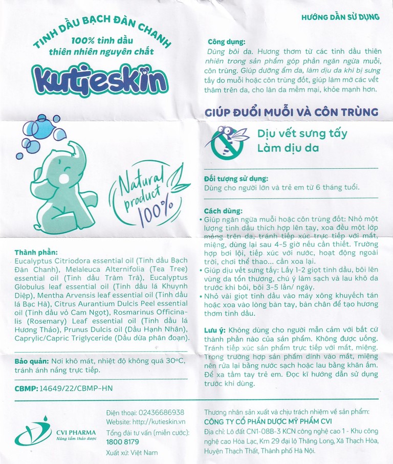 Nếu bạn đang tìm một giải pháp đơn giản, tiện lợi để xua đuổi muỗi và làm dịu làn da bé yêu khi bị đốt, tinh dầu thiên nhiên Kutieskin chính là lựa chọn đáng tin cậy. Sản phẩm được điều chế từ tinh dầu thiên nhiên, thân thiện với làn da và phù hợp với cả trẻ nhỏ từ 6 tháng tuổi.