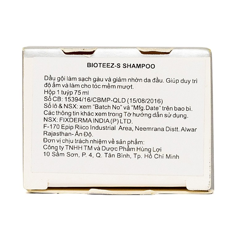 Bioteez-S là dầu gội giảm gàu chứa Zinc Pyrithione và Salicylic Acid, giúp loại bỏ vảy gàu, làm sạch da đầu và duy trì độ ẩm mà không gây khô tóc. Sản phẩm được sản xuất bởi Fixderma Ấn Độ và có số công bố rõ ràng tại Việt Nam, phù hợp dùng tại nhà từ 2 – 3 lần/tuần. Kết cấu dạng tuýp dễ dùng, thích hợp mang theo khi đi làm, đi học hoặc du lịch.