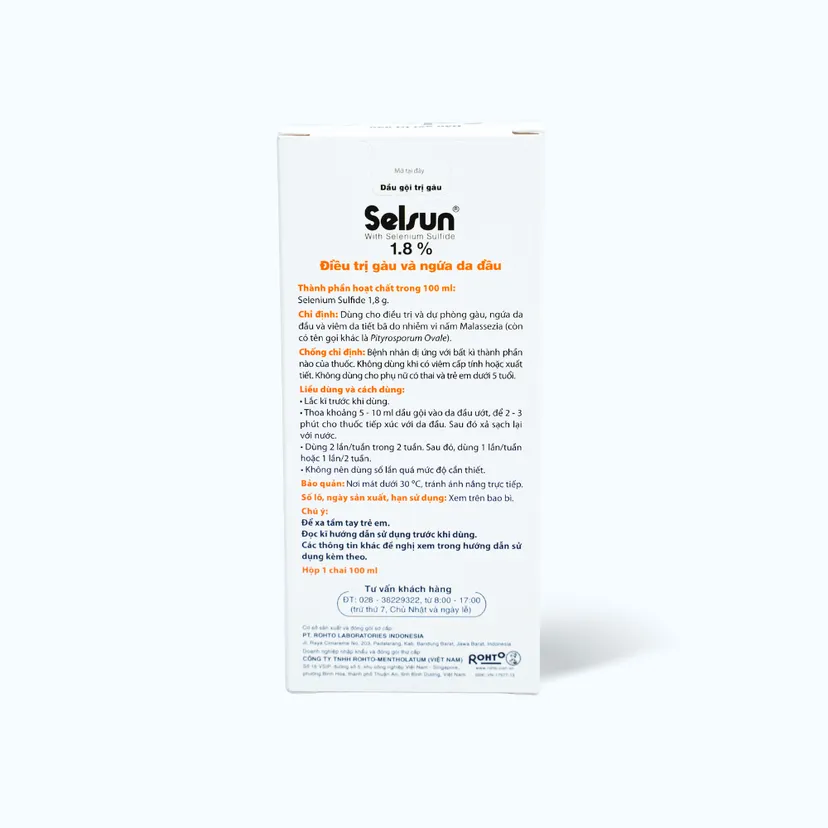 Dầu gội Selsun 1,8% của công ty Rohto Mentholatum, thành phần chính selenium sulfide ,dùng cho điều trị và dự phòng gàu, ngứa da đầu và viêm da tiết bã do nhiễm vi nấm Malassezia