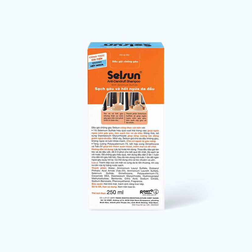 Dầu gội chống gàu Selsun được sản xuất bởi tập đoàn dược phẩm Rohto – Mentheolatum. Sở hữu những đặc điểm ưu việt nhờ ứng dụng công nghệ vượt trội Selenium Sulfide, dầu gội chống gàu Selsun có khả năng loại bỏ mọi loại gàu, đặc biệt là gàu được gây nên bởi nấm Malassezia. Không chỉ giúp xử lý triệt để tình trạng da đầu bị gia tăng sừng hóa, nổi mảng gàu, mà dầu gội chống gàu Selsun còn giúp ngăn cản gàu, ngứa quay trở lại.