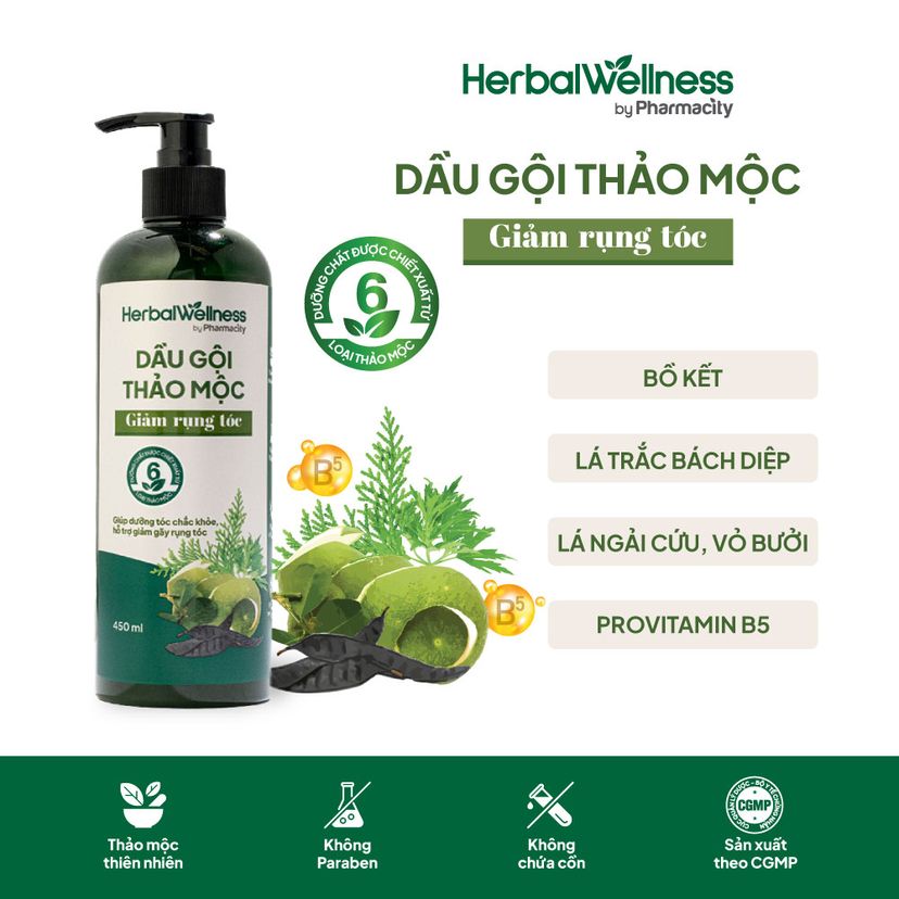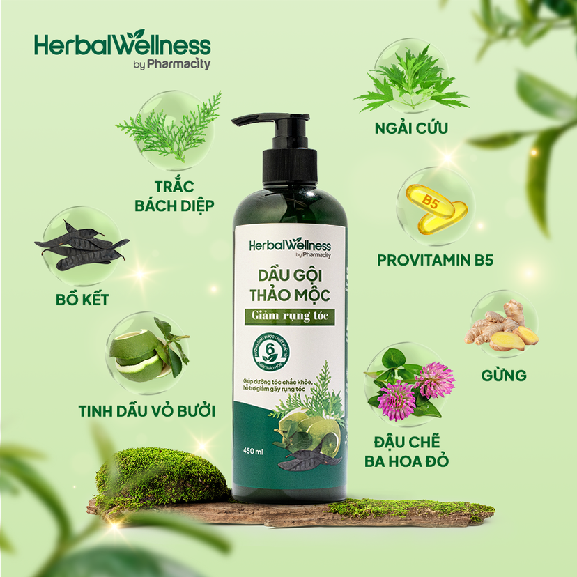 Dầu gội Thảo Mộc Giảm Rụng Tóc Herbal Wellness by Pharmacity, dưỡng chất được chiết xuất từ nhiều thành phần thảo mộc từ thiên nhiên và Provitamin B5.