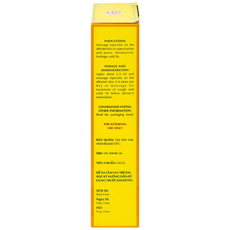 • Dùng ngoài để xoa bóp lên nơi đau trong trường hợp nhức mỏi, tê thấp, đau lưng, cảm mạo, cúm.