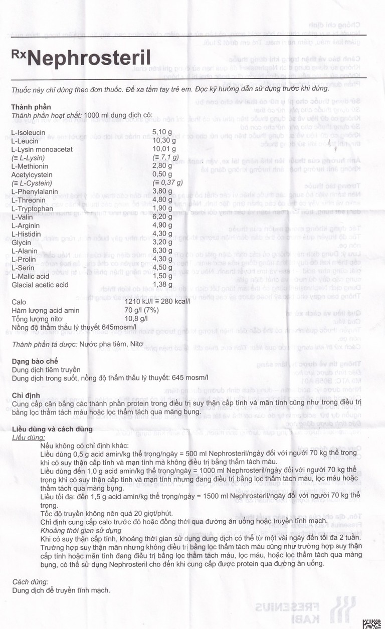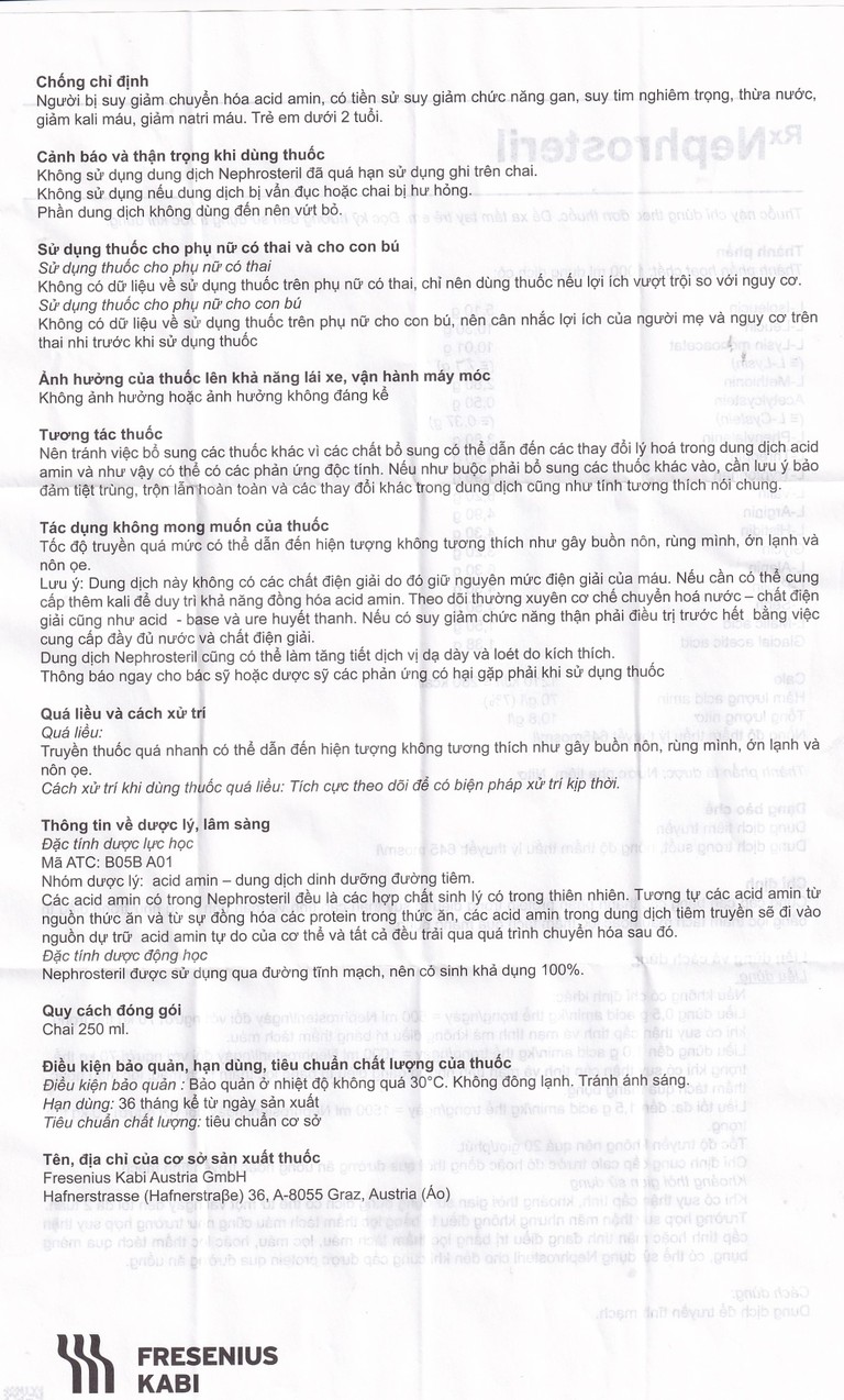 Liều tối đa: đến 1,5 g acid amin/kg thể trọng/ngày = 1500 ml Nephrosteril/ngày đối với người 70 kg thể trọng.