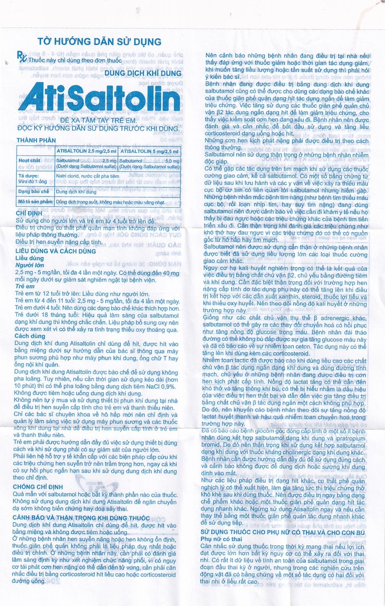 Dung dịch khí dung Atisaltolin chỉ dùng để hít, được hít vào bằng miệng và không được tiêm hoặc uống.