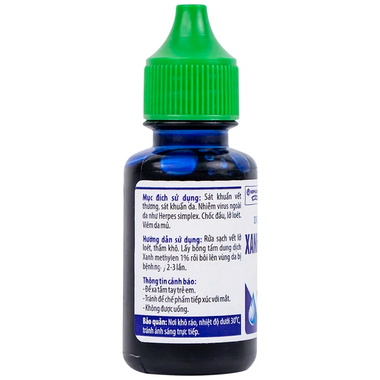 Dung Dịch Xanh Methylen 1% dùng điều trị nhiễm virus ngoài da như Herpes simplex, chốc đầu, lở loét, viêm da mủ