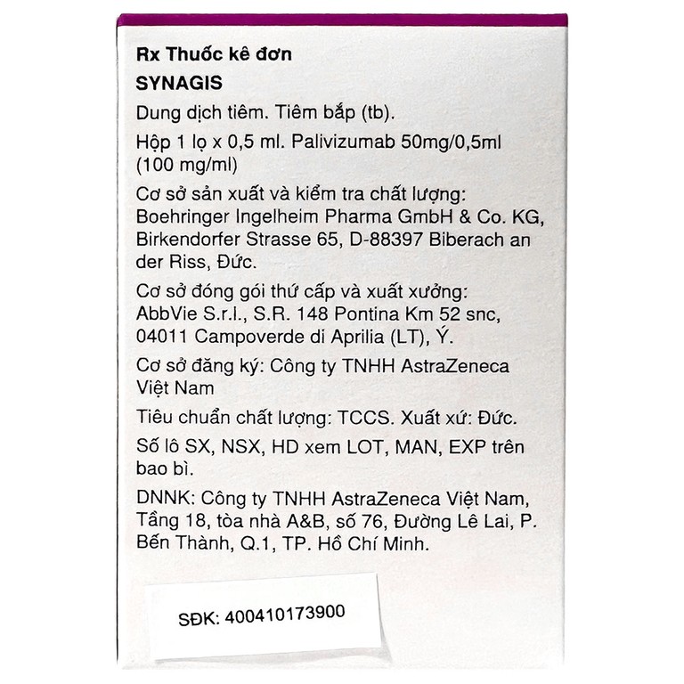 Dung dịch tiêm Synagis 50mg/0.5ml Astrazeneca điều trị để phòng ngừa bệnh đường hô hấp