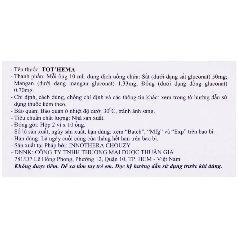 Dung dịch Tot’héma Innothera điều trị thiếu máu do sắt (2 vỉ x 10 ống x 10ml)