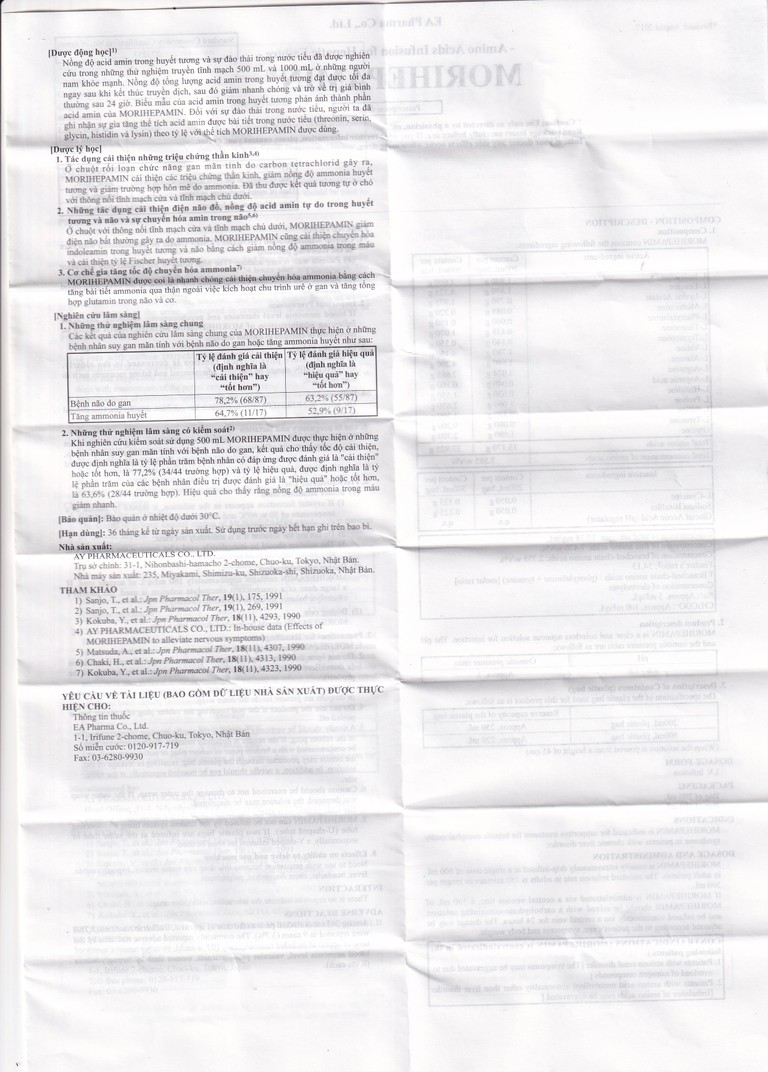 Nồng độ acid amin trong huyết tương và sự đào thải trong nước tiểu đã được nghiên cứu trong những thử nghiệm truyền tĩnh mạch 500 ml và 1000 ml ở những người nam khỏe mạnh. Nồng độ tổng lượng acid amin trong huyết tương đạt được tối đa ngay sau khi kết thúc truyền dịch, sau đó giảm nhanh chóng và trở về trị giá bình thường sau 24 giờ. Biểu mẫu của acid amin trong huyết tương phản ánh thành phần acid amin của Morihepamin. Đối với sự đào thải trong nước tiểu, người ta đã ghi nhận sự gia tăng thể tích acid amin được bài tiết trong nước tiểu (threonine, serine, glycine, histidine và lysine) theo tỷ lệ với thể tích Morihepamin được dùng.
