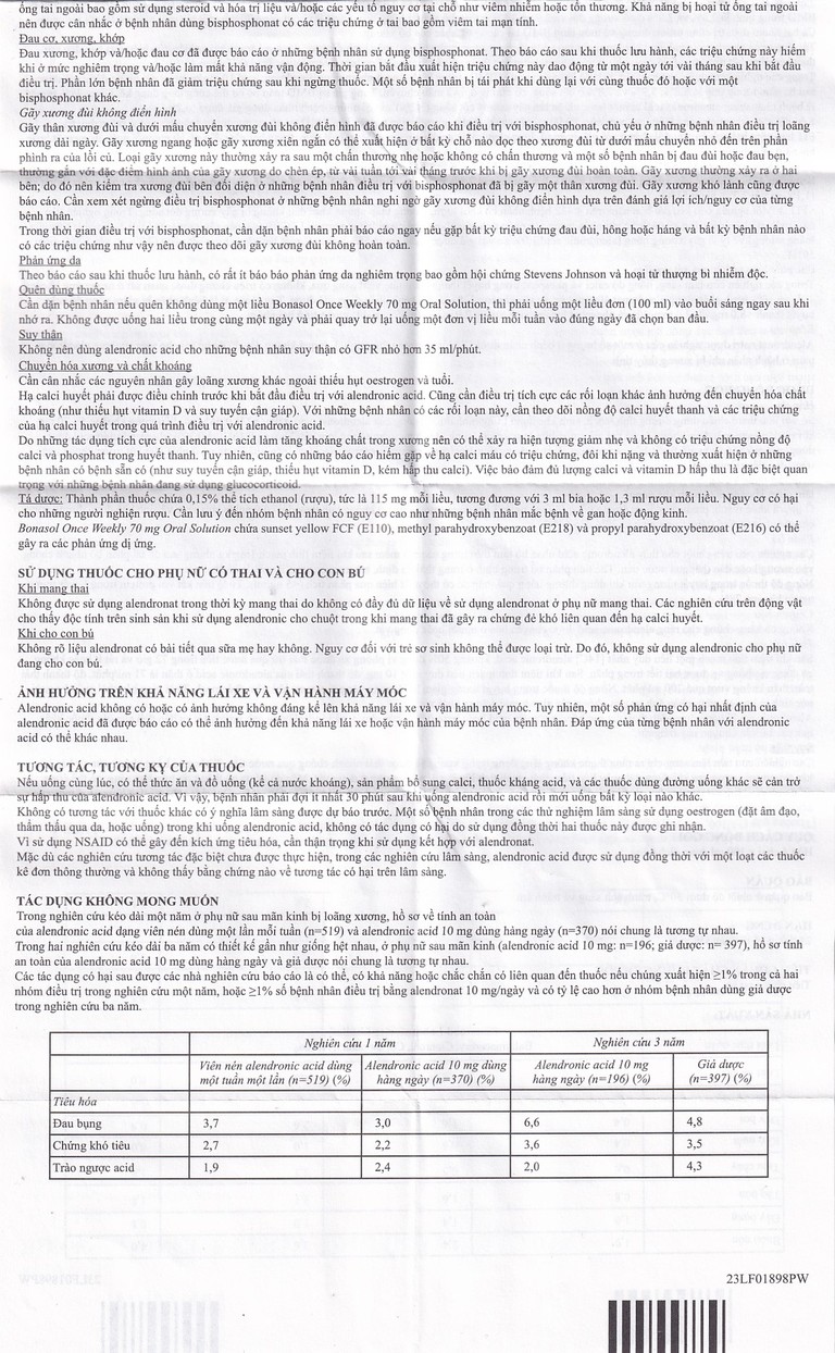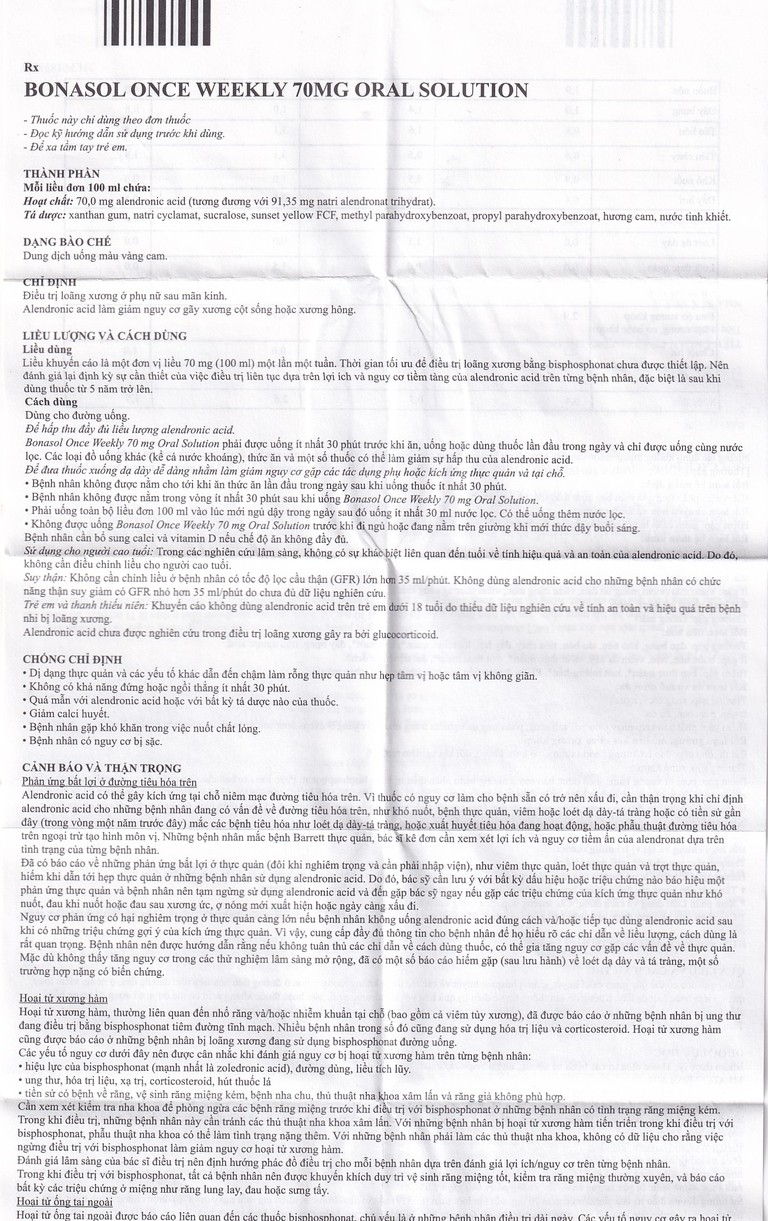 - Bệnh nhân không được nằm trong vòng ít nhất 30 phút sau khi uống Bonasol Once Weekly 70 mg Oral Solution.