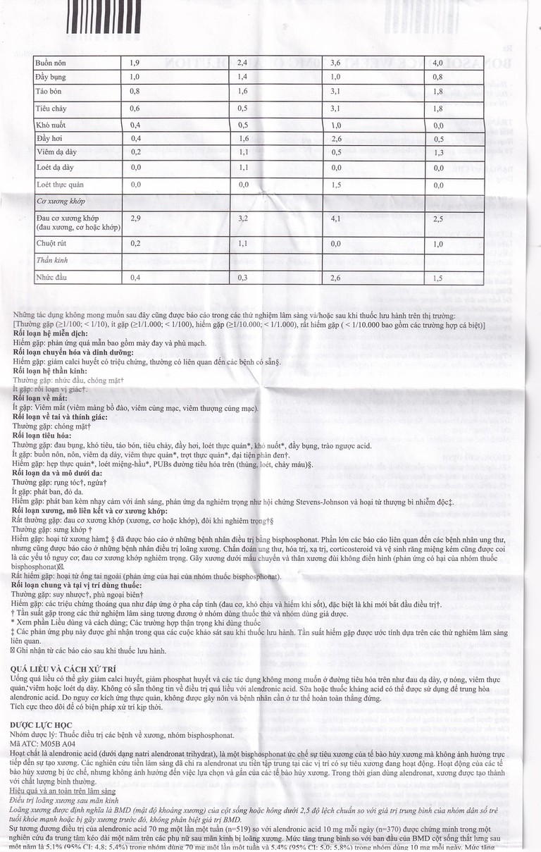 - Hiếm gặp: Hoại tử xương hàm‡§ đã được báo cáo ở những bệnh nhân điều trị bằng bisphosphonat. Phần lớn các báo cáo liên quan đến các bệnh nhân ung thư, nhưng cũng được báo cáo ở những bệnh nhân điều trị loãng xương. Chẩn đoán ung thư, hóa trị, xạ trị, corticosteroid và vệ sinh răng miệng kém cũng được coi là các yếu tố nguy cơ; đau cơ xương khớp nghiêm trọng. Gãy xương dưới mấu chuyển và thân xương đùi không điển hình (phản ứng có hại của nhóm thuốc bisphosphonat)⛝.