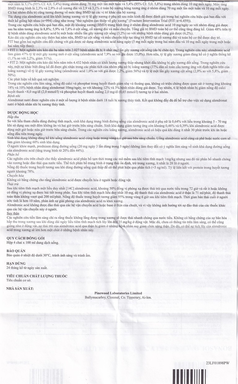 Tác dụng của alendronic acid lên khối lượng xương và tỷ lệ gãy xương ở phụ nữ sau mãn kinh đã được đánh giá trong hai nghiên cứu hiệu quả ban đầu với thiết kế giống hệt nhau (n=994) cũng như trong “thử nghiệm can thiệp về gãy xương” (Fracture Intervention Trial (FIT: n=6.459)).
