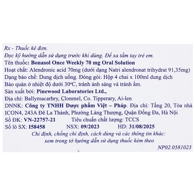 Dung dịch uống Bonasol Once Weekly 70mg Oral Solution Pinewood điều trị loãng xương (4 chai x 100 ml)