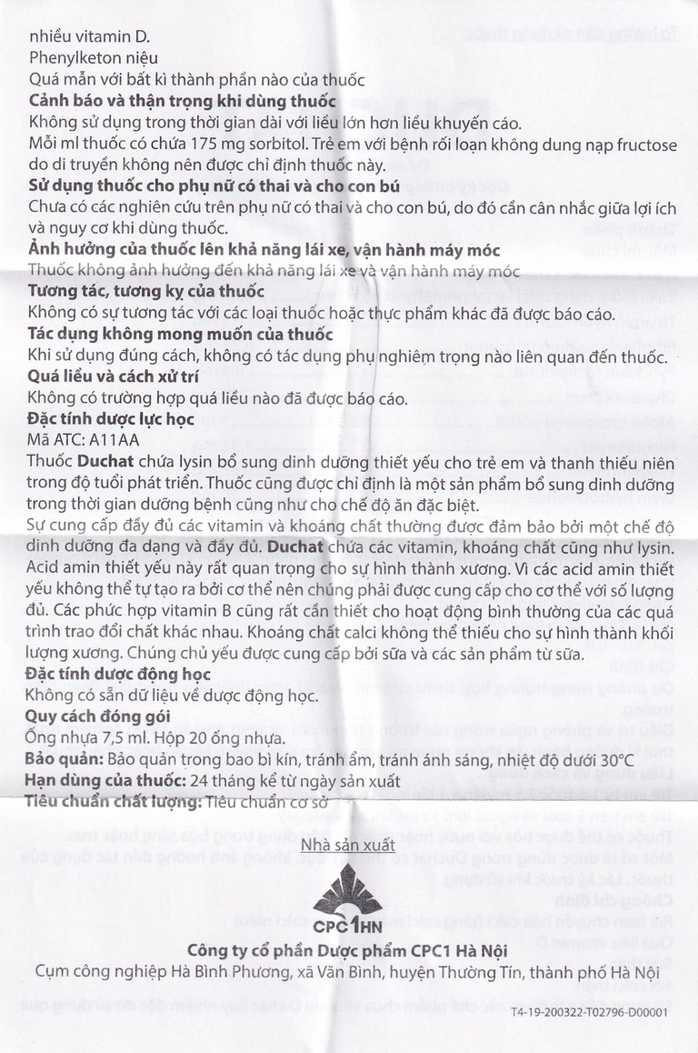 Thuốc Duchat chứa lysin bổ sung dinh dưỡng thiết yếu cho trẻ em và thanh thiếu niên trong độ tuổi phát triển. Thuốc cũng được chỉ định là một sản phẩm bổ sung dinh dưỡng trong thời gian dưỡng bệnh cũng như cho chế độ ăn đặc biệt.