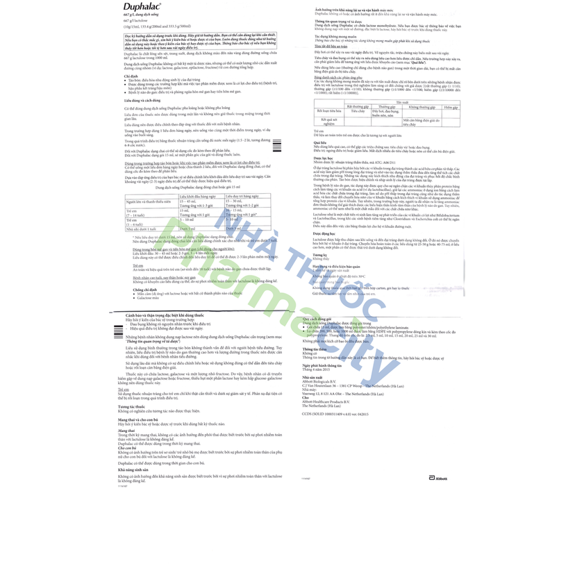 - Dung dịch uống Duphalac không có bất kỳ một tá dược nào, nhưng có thể có một lượng nhỏ các dẫn xuất đường cùng nhóm (ví dụ: lactose, galactose, epilactose, fructose) từ con đường tổng hợp.
