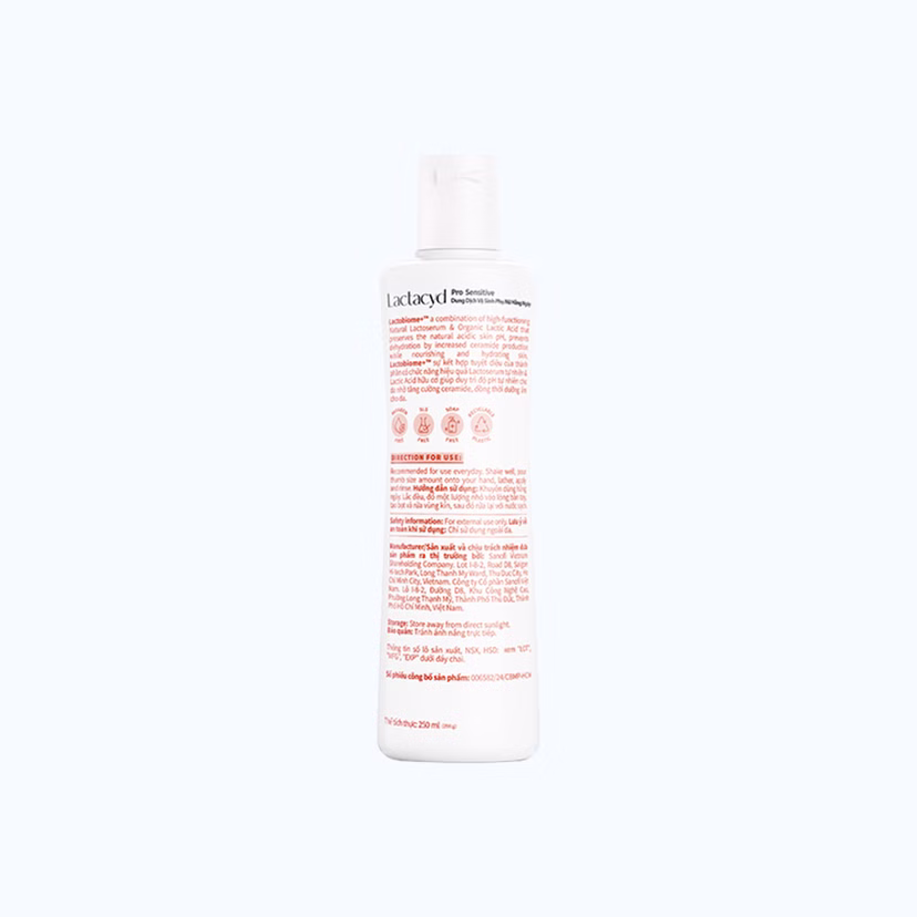 Lactacyd Pro Sensitive 250ml là sản phẩm dung dịch vệ sinh phụ nữ giúp bảo vệ, kháng khuẩn và ngăn ngừa viêm nhiễm, ngứa ngáy vùng nhạy cảm. Được chiết xuất từ sữa và Lactoserum, sản phẩm có mùi hương tinh tế và dễ chịu, thích hợp dùng hàng ngày vì đã được kiểm nghiệm da liễu an toàn với làn da.
