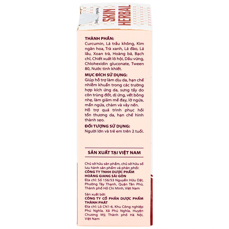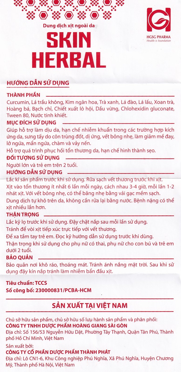 Dung dịch xịt ngoài da Skin Herbal được sản xuất bởi Công ty Cổ phần Dược phẩm Thành Phát, chịu trách nhiệm sản xuất và phân phối bởi Công ty TNHH Dược phẩm Hoàng Giang Sài Gòn. Với hơn 13 năm kinh nghiệm về mảng nghiên cứu, sản xuất, phân phối dược phẩm, hiện dược HGSG là đối tác chiến lược của bang NSW Australia tại Việt Nam và một số quốc gia khác như: Mỹ, Đức, Newzeland, Ấn Độ, Trung Quốc.