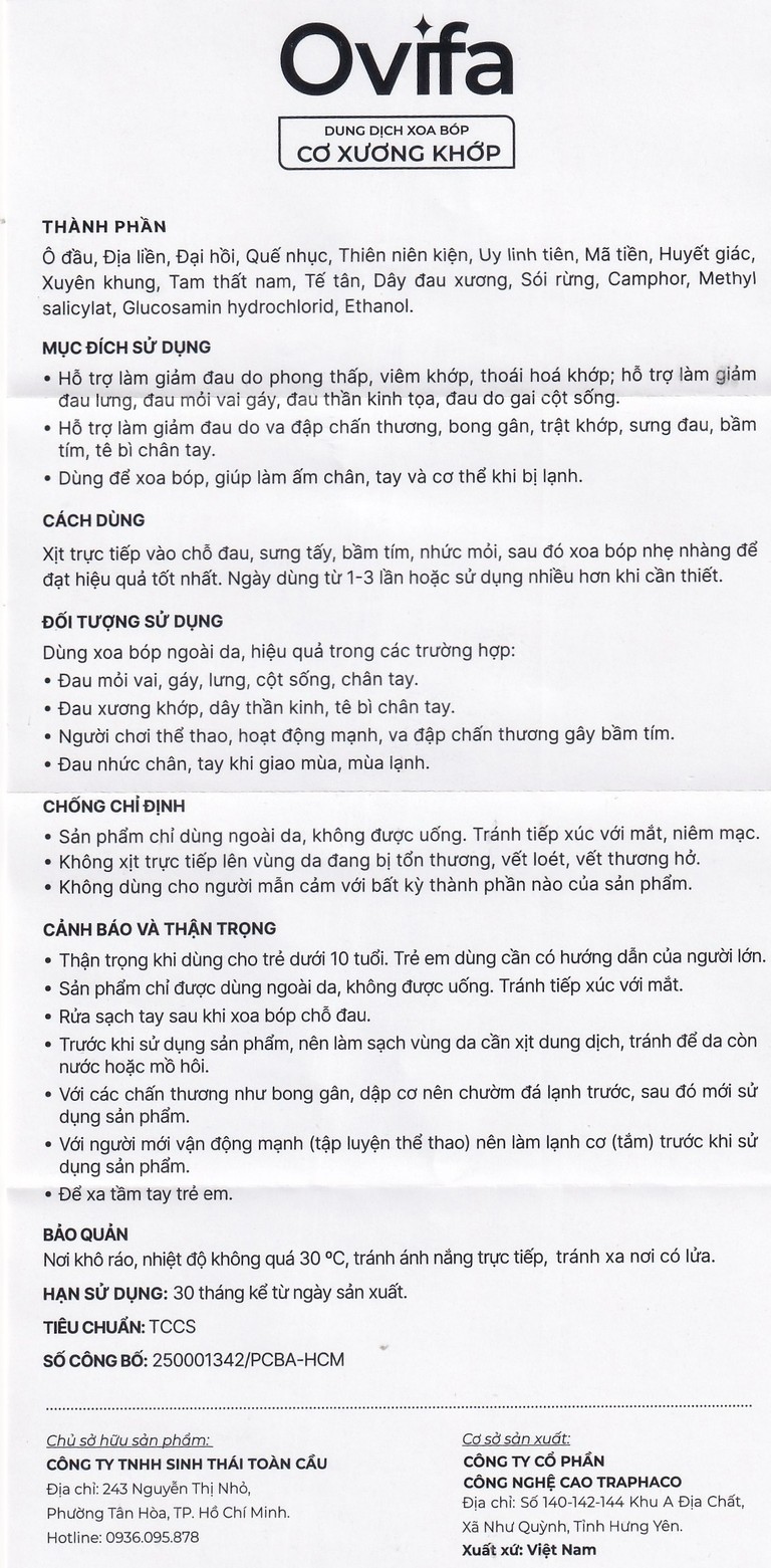 Dung dịch xoa bóp cơ xương khớp Ovifa có công dụng: