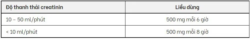 Ở bệnh nhân suy thận cần phải giảm liều. Liều dùng phụ thuộc vào mức độ suy thận (biểu thị bằng độ thanh thải creatinin) ở từng bệnh nhân cụ thể như sau: