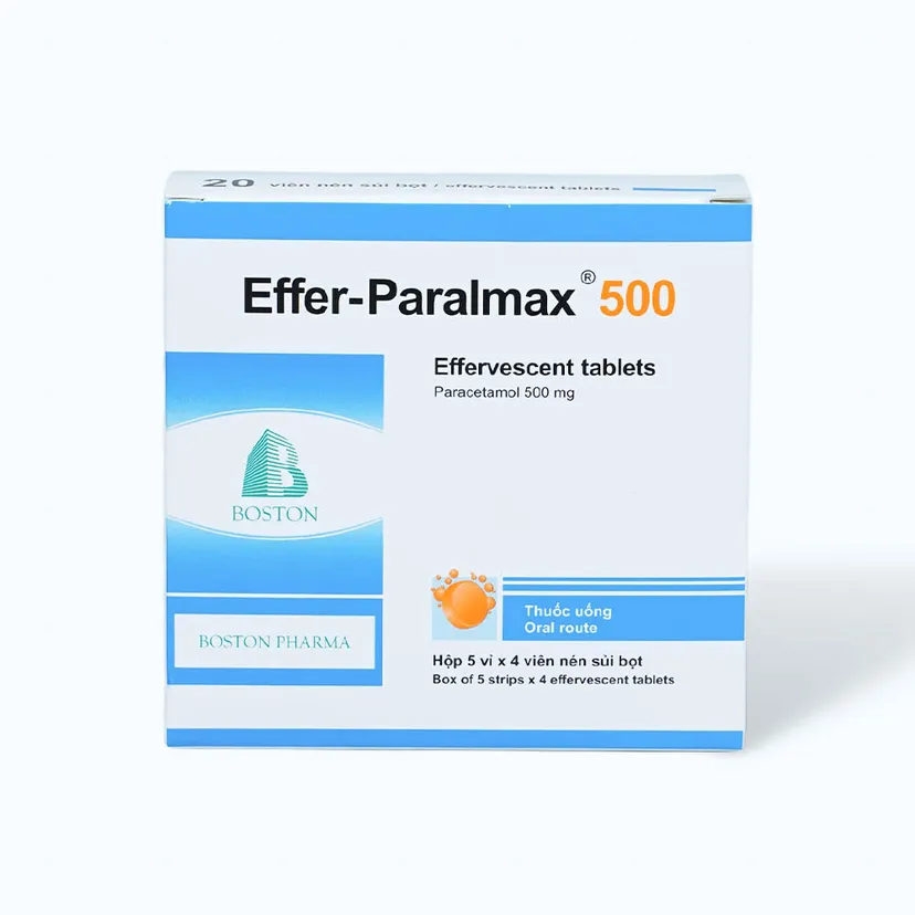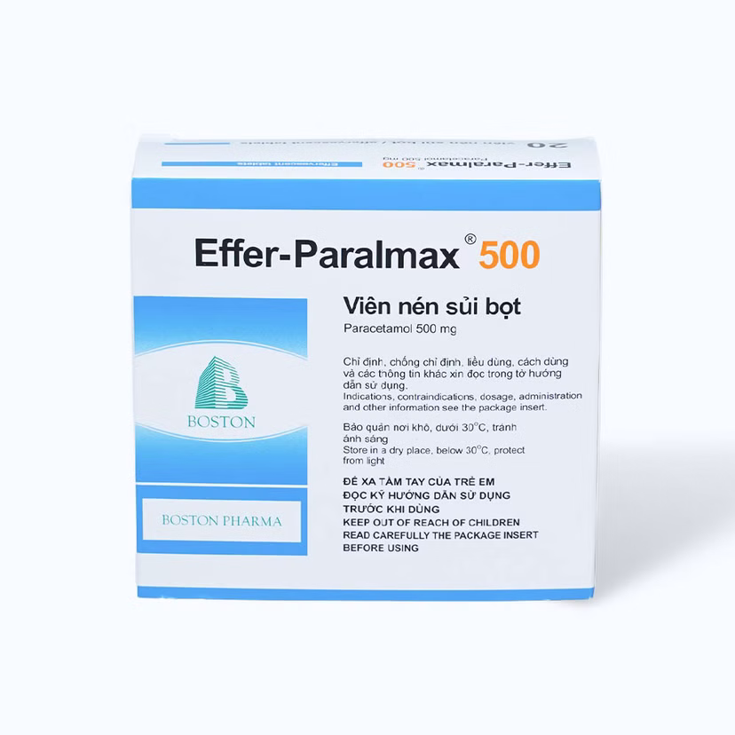 Viên sủi bọt Effer- Paralmax 500mg là một loại thuốc chứa Paracetamol được chỉ định giảm đau trong các trường hợp đau nhẹ đến vừa như: đau đầu, đau nửa đầu, đau răng, đau nhức do cảm cúm, đau họng, đau nhức cơ xương, đau do viêm khớp. Effer- Paralmax 500mg cũng được sử dụng trong hạ sốt do mọi nguyên nhân gây sốt.