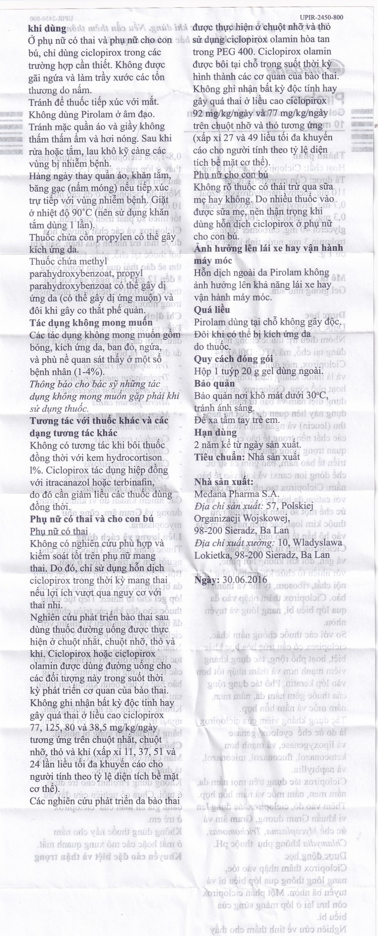 Bôi Pirolam 20g 2 lần mỗi ngày lên vùng da bị nhiễm, xoa nhẹ nhàng hoặc để lớp gel khô tự nhiên. Tiếp tục dùng thuốc cho đến khi các triệu chứng đã hết. Thời gian điều trị tối ưu với ciclopirox olamin lên đến 3 tuần.