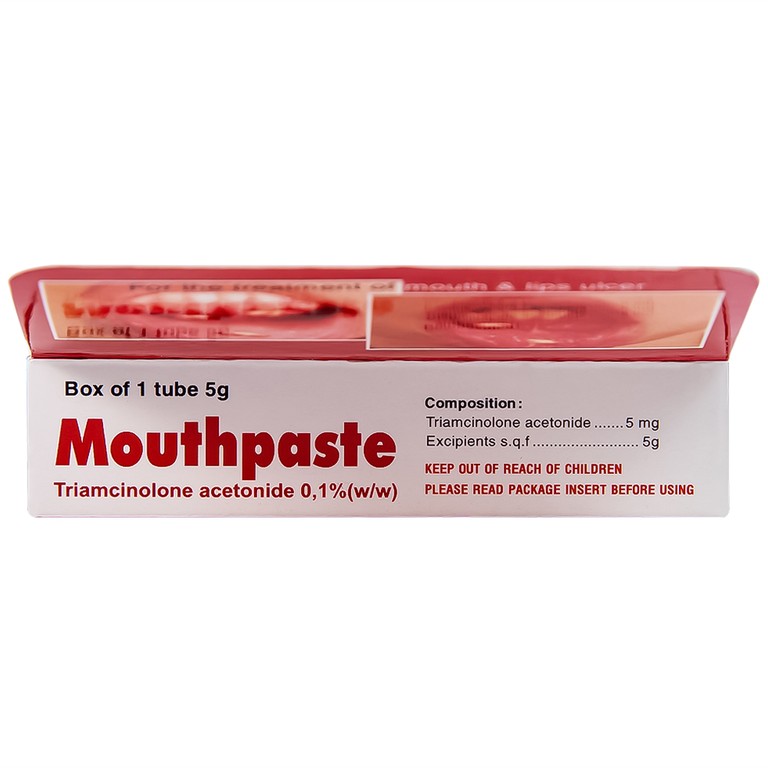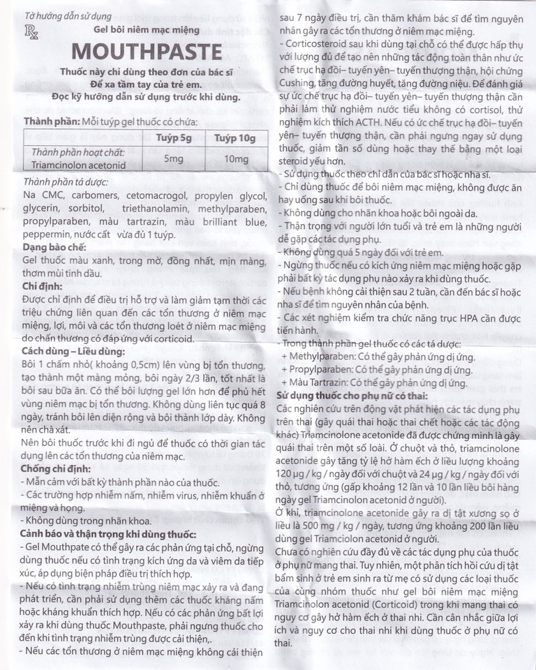 Các phản ứng tại chỗ có thể xảy ra do corticosteroid có chứa trong gel Mouthpaste: Rát, nóng, ngứa, kích ứng, khô niêm mạc, đỏ niêm mạc, phồng rộp, mỏng niêm mạc miệng, viêm da quanh miệng, nhiễm trùng thứ cấp, và teo bì chính của sản phẩm, niêm mạc miệng.