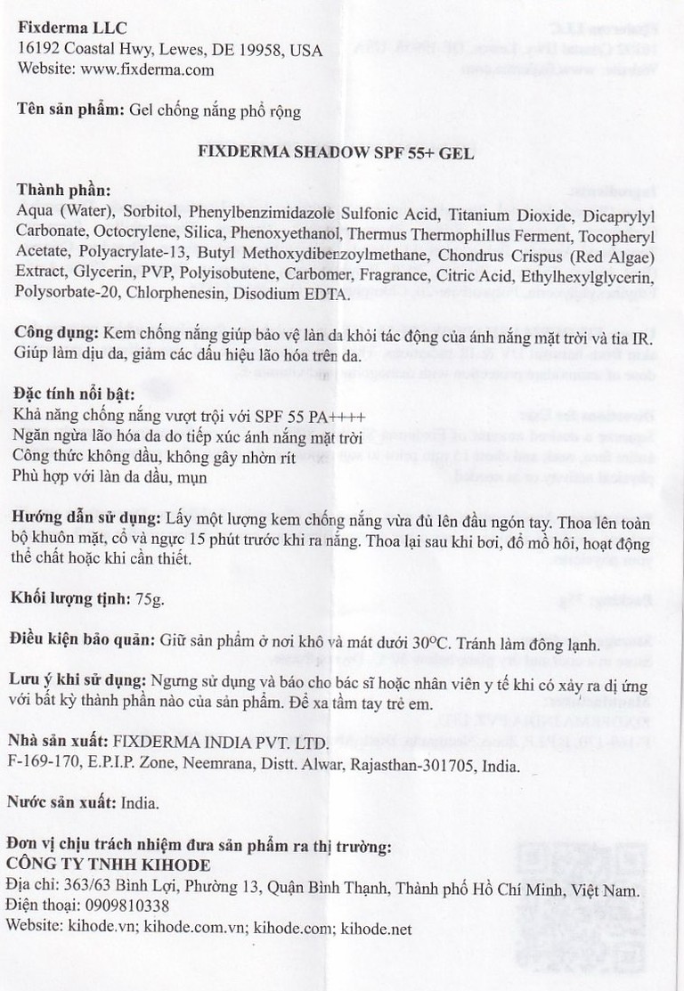 Gel chống nắng Fixderma Shadow SPF 55+ bảo vệ da khỏi tia UV, dưỡng ẩm (75g)SẢN PHẨM
