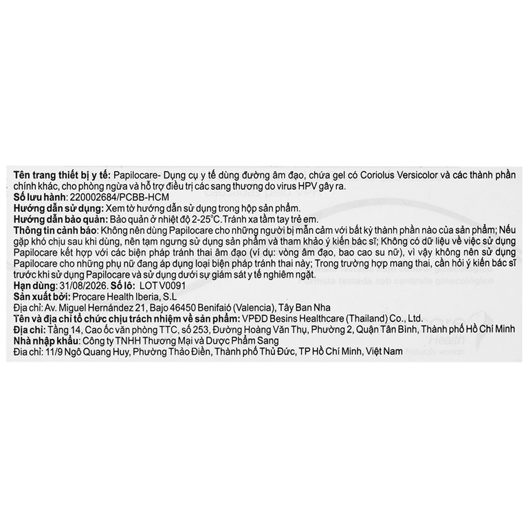 Gel đặt âm đạo Papilocare Procare Health phòng ngừa và điều trị tổn thương do HPV (21 tuýp)SẢN PHẨM